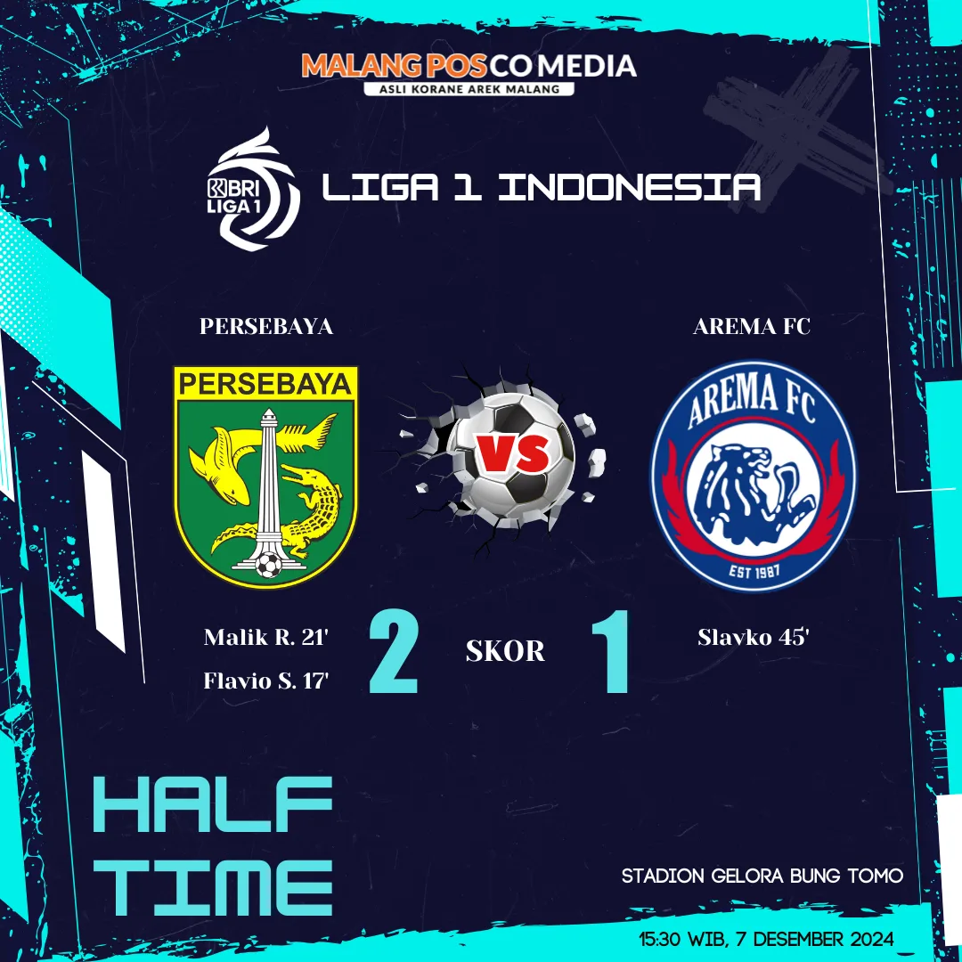 MALANG POSCO MEDIA, SURABAYA – Arema FC dalam kondisi tertinggal di 45 menit babak pertama laga melawan Persebaya di Stadion Gelora Bung Tomo Surabaya, Sabtu (7/12) sore ini. Tim Singo Edan tertinggal dengan skor 1-2 begitu wasit meniup peluit tanda jeda pertandingan.