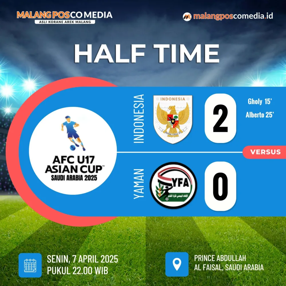 MALANG POSCO MEDIA – Fadly Alberto dan Zahaby Gholy membawa tim nasional U-17 Indonesia unggul 2-0 atas Yaman pada laga lanjutan Grup C Piala Asia U-17 2025 di Stadion Prince Abdullah Al Faisal Sport City, Jeddah, Arab Saudi, Senin.