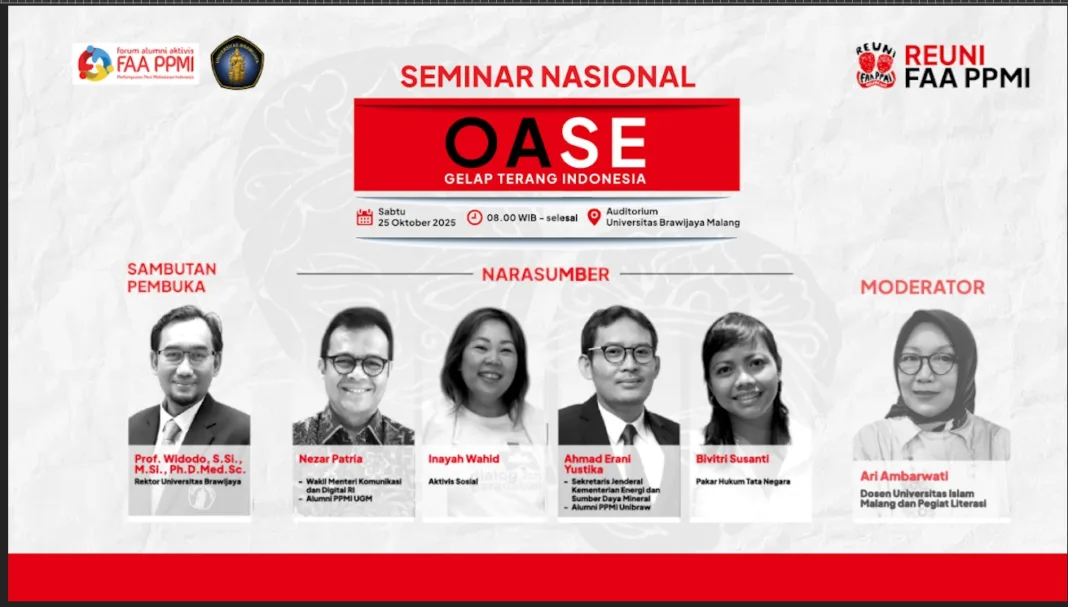 Acara reuni FAA PPMI akan dibuka dengan seminar nasional bertajuk “Oase Gelap Terang Indonesia” yang menghadirkan sejumlah tokoh. Sambutan pembuka akan disampaikan oleh Rektor Universitas Brawijaya Prof. Widodo, S.Si., M.Si., Ph.D.Med.Sc.