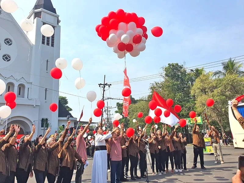 MALANG POSCO MEDIA, MALANG – Suasana penuh warna mewarnai Gereja Katedral Paroki Santa Perawan Maria dari Gunung Karmel (Gereja Katedral Ijen) Kota Malang, Minggu (17/8) kemarin. Jemaat yang tergabung dalam Komunitas Misa Pagi (KOMPAG) merayakan Hari Ulang Tahun (HUT) ke-80 Republik Indonesia dengan cara unik, mulai dari mengenakan kostum tematik, menyanyi bersama, hingga melepas balon merah putih ke udara.