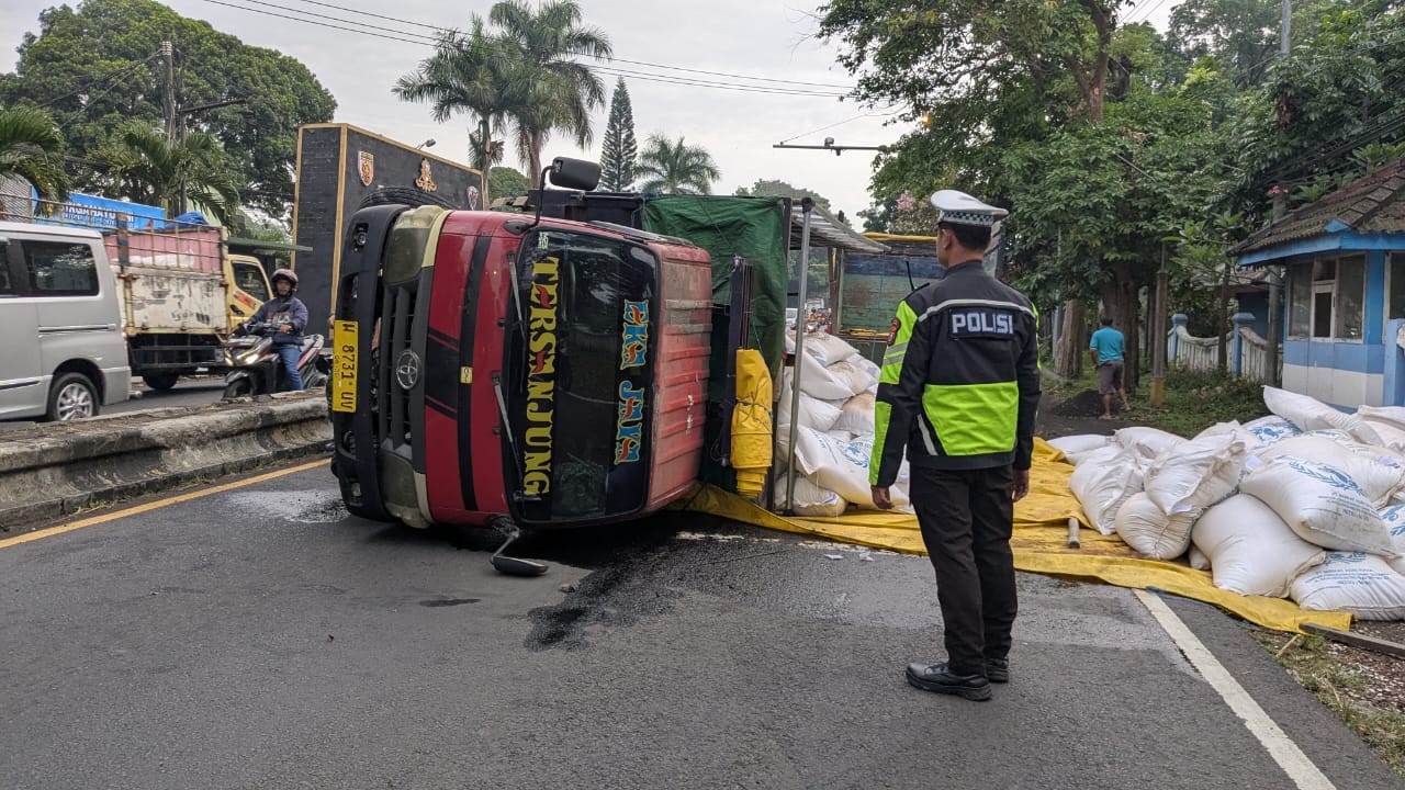 Truk dengan jumlah muatan sekitar 7 ton tersebut terguling ke kiri tengah ruas jalan, hingga muatan pakan sapi yang dibungkus dalam karung tumpah ke jalan raya.