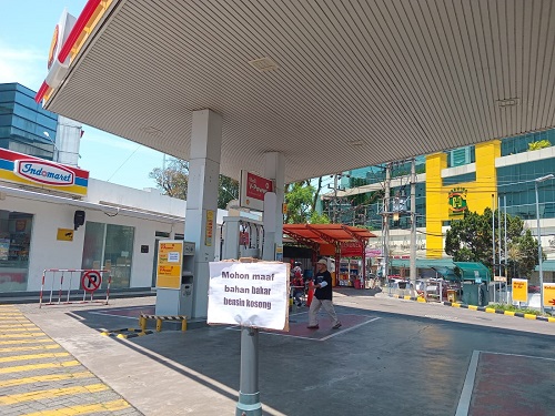 Sementara hal yang sama juga terlihat di area masuk SPBU Shell di Jalan Kawi. Terpasang papan pengumuman. Yakni bertuliskan, “Mohon Maaf Bakan Bakar Bensin Kosong”.
