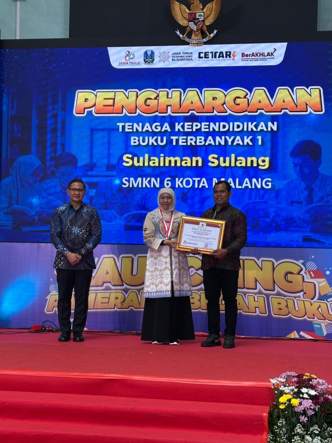 MALANG POSCO MEDIA, MALANG – Tenaga Kependidikan SMKN 6 Malang, Sulaiman Sulang mendapat penghargaan dari Dinas Provinsi Jawa Timur. Pria yang akrab disapa Sule ini, terpilih sebagai Tenaga Kependidikan (Tendik) berprestasi dengan karya buku terbanyak. Dia telah menghasilkan 33 karya buku.
