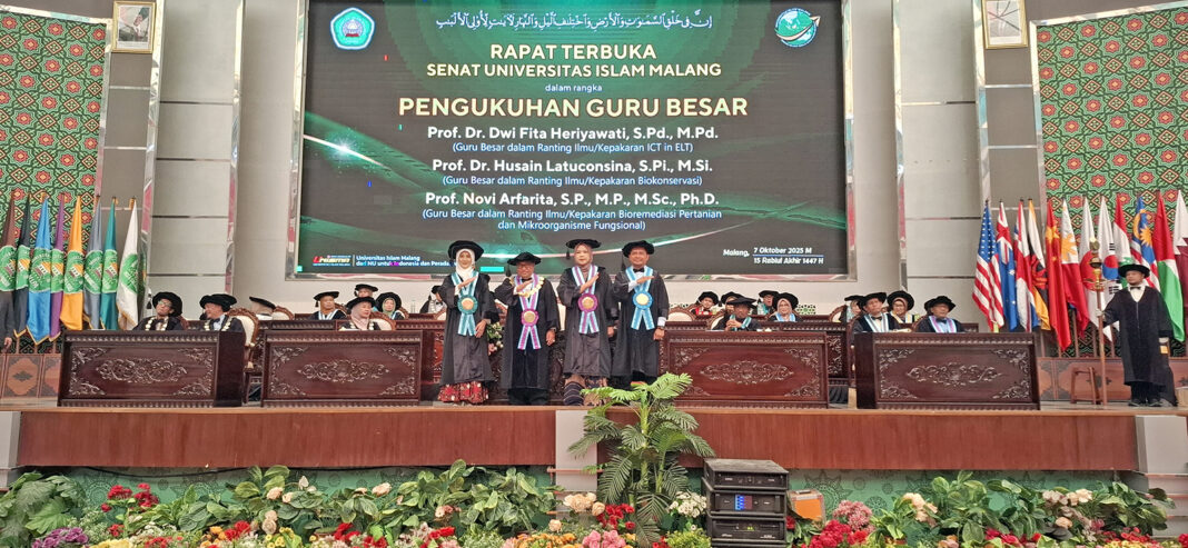MALANG POSCO MEDIA, MALANG – Universitas Islam Malang (Unisma) kembali menambah jumlah Guru Besar. Selasa (7/10) kemarin, Rektor Unisma Prof. Drs. Junaidi, M.Pd., Ph.D mengukuhkan tiga profesor baru. Mereka adalah Prof. Dr. Dwi Fita Heriyawati, M.Pd dalam ranting ilmu ICT in ELT, Prof. Dr. Husain Latuconsina, S.Pi., M.Si Dalam bidang ranting ilmu Biokonservasi dan Prof. Hj. Novi Arfarita, SP., MP., M.Sc., Ph.D dalam bidang ranting ilmu Bioremediasi Pertanian dan Mikroorganisme Fungsional.